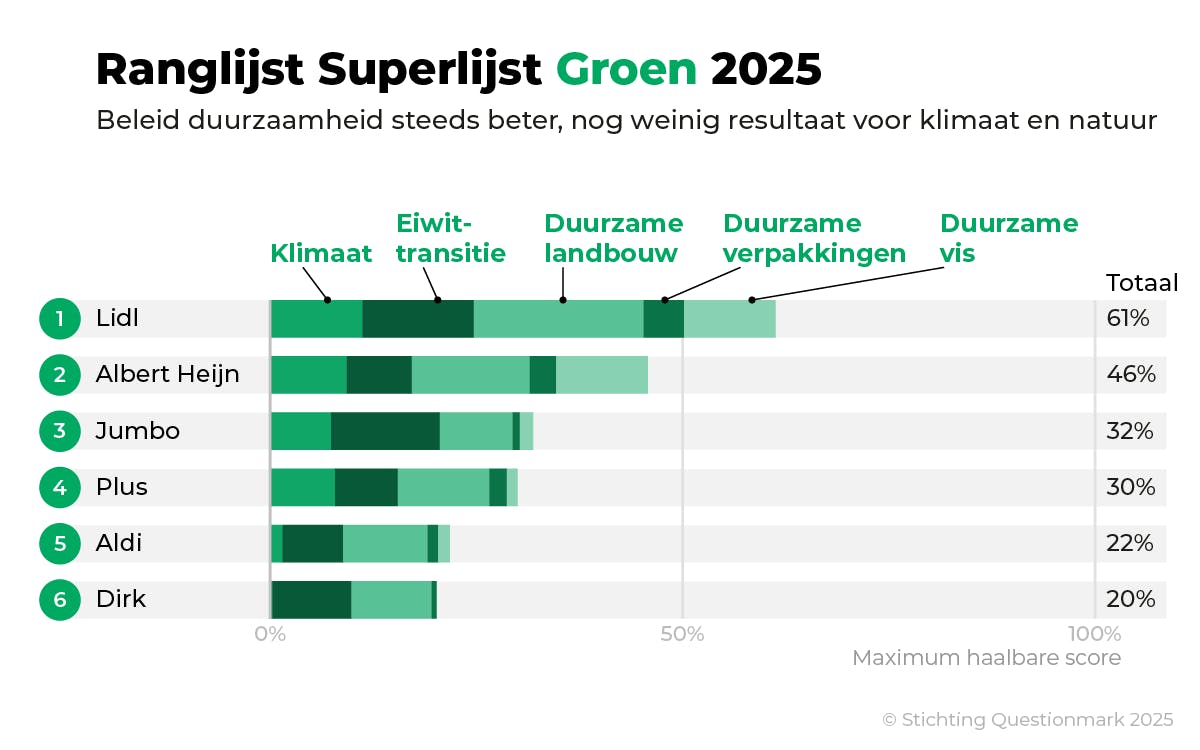 Over de hele linie geldt dat supermarkten hun uitstoot niet of onvoldoende terugdringen. De vertaling van doelen en plannen naar praktijk blijft dus uit. Ook blijft de verkoop van dierlijk en biologisch eten onveranderd, in tegenstelling tot de doelen die supermarkten zelf stellen. Zo laat Superlijst Groen zien, een initiatief van Questionmark, in samenwerking met Milieudefensie en Mighty Earth, en steun van de Vegetariërsbond.