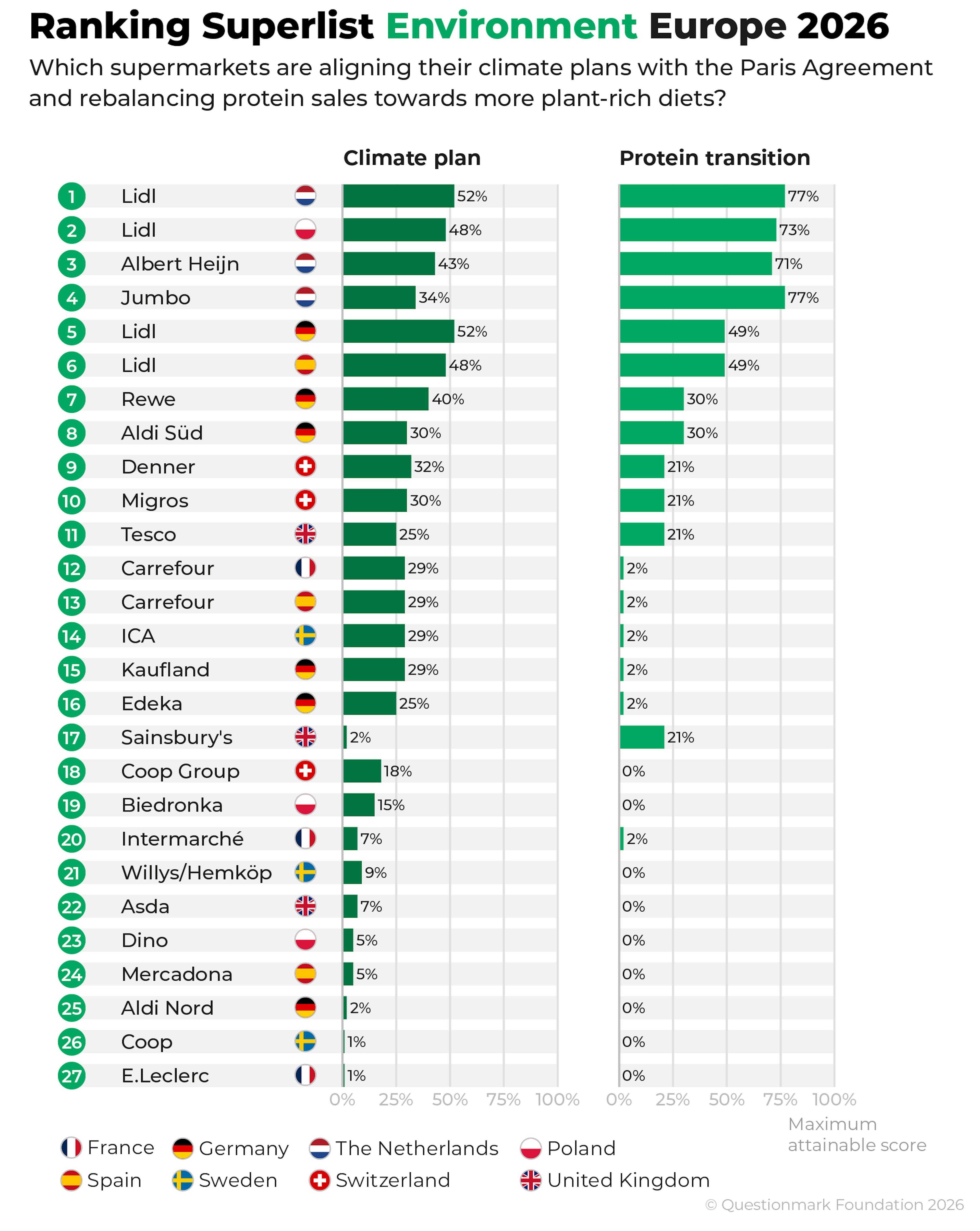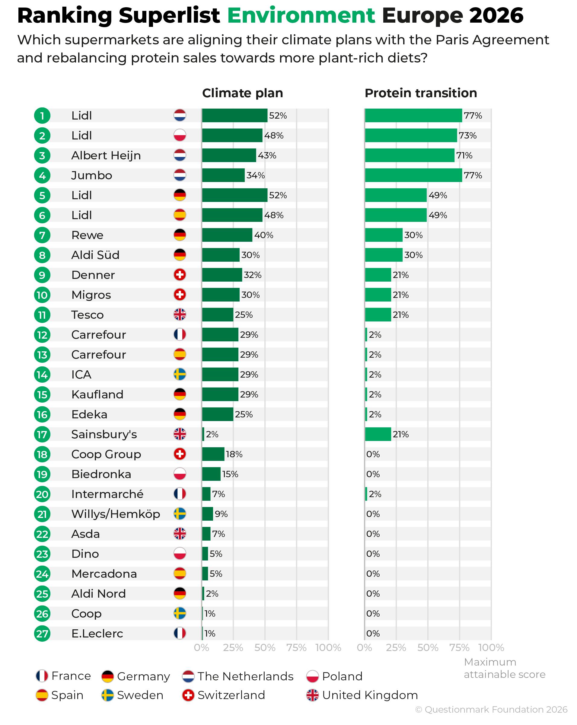 First European benchmark of 27 supermarkets across 8 countries highlights leaders and gaps in climate action and protein transition: Dutch and German chains are leading, but none show strong reductions in greenhouse gas emissions.