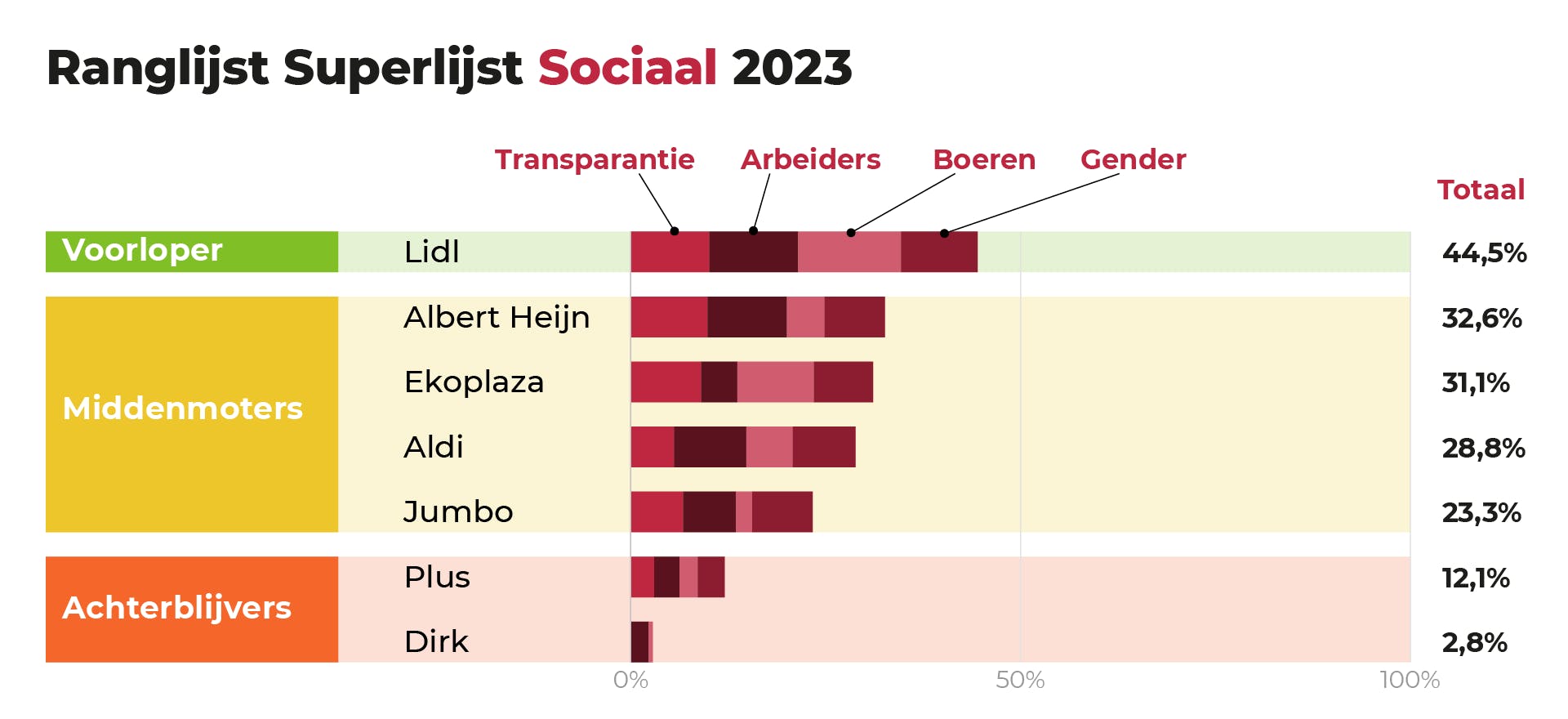 Geen enkele supermarkt toont vergaande maatregelen voor het naleven van mensenrechten in hun voedselproductieketens. Supermarkten hebben wel beleid en ze krijgen steeds meer zicht op waar de risico’s op kinderarbeid, discriminatie en uitbuiting zich voordoen. Maar concrete acties van supermarkten om de rechten van arbeiders, boeren en vrouwen te respecteren, blijven grotendeels uit. Lidl loopt voorop in de ranglijst van Superlijst Sociaal, gevolgd door Albert Heijn, Ekoplaza, Aldi en Jumbo in de middenmoot en Plus en Dirk vormen de achterblijvers.