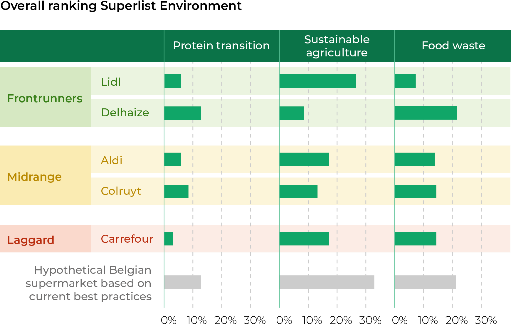 Superlist Environment in Belgium compares the supermarkets with the largest market share on the issues: plant-based food, sustainable agriculture and deforestation, and food waste.