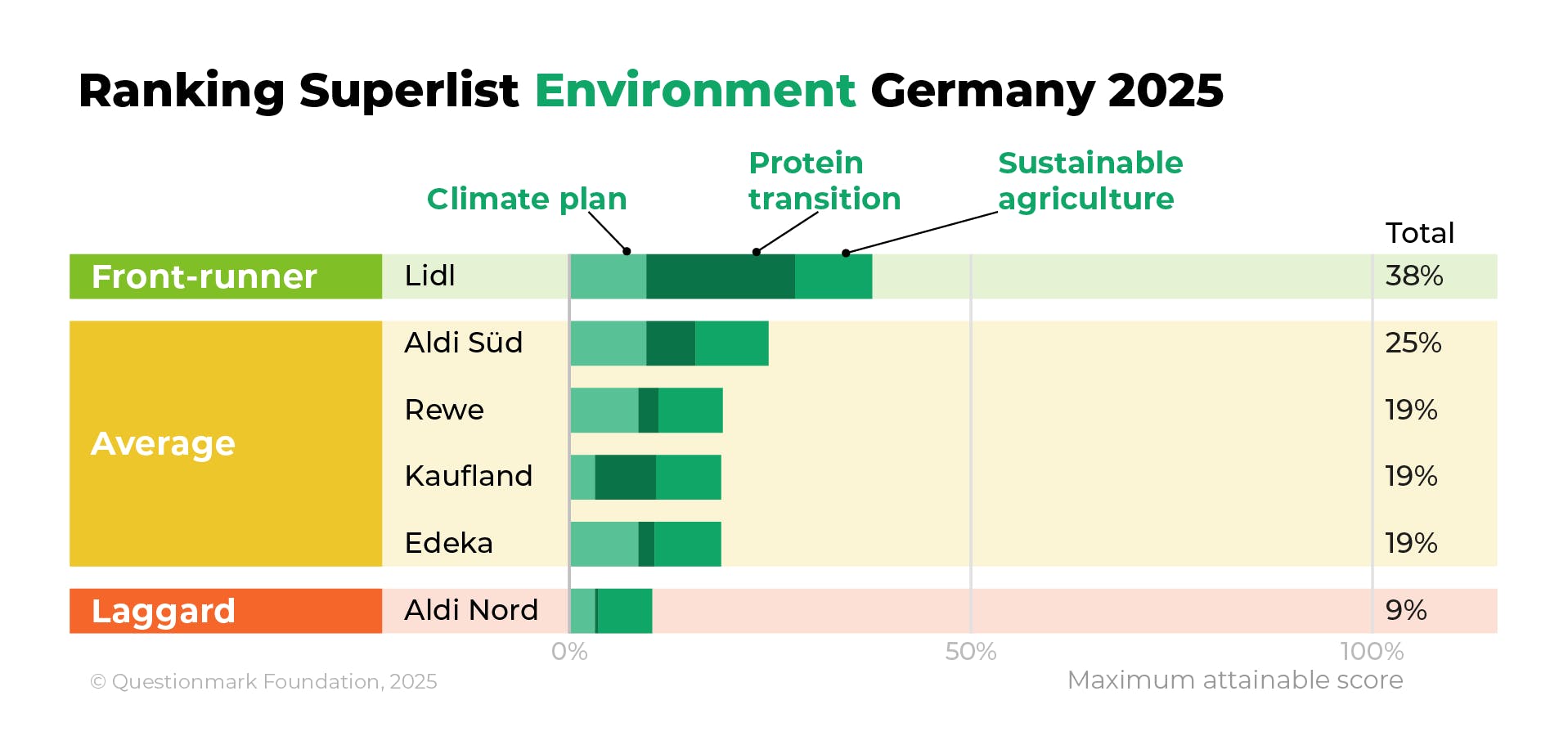 Superlist Environment in Germany compares the supermarkets with the largest market share (Aldi Nord, Aldi Süd, Edeka, Kaufland, Lidl and Rewe) on the issues: protein transition, sustainable agriculture and deforestation, and climate plans.