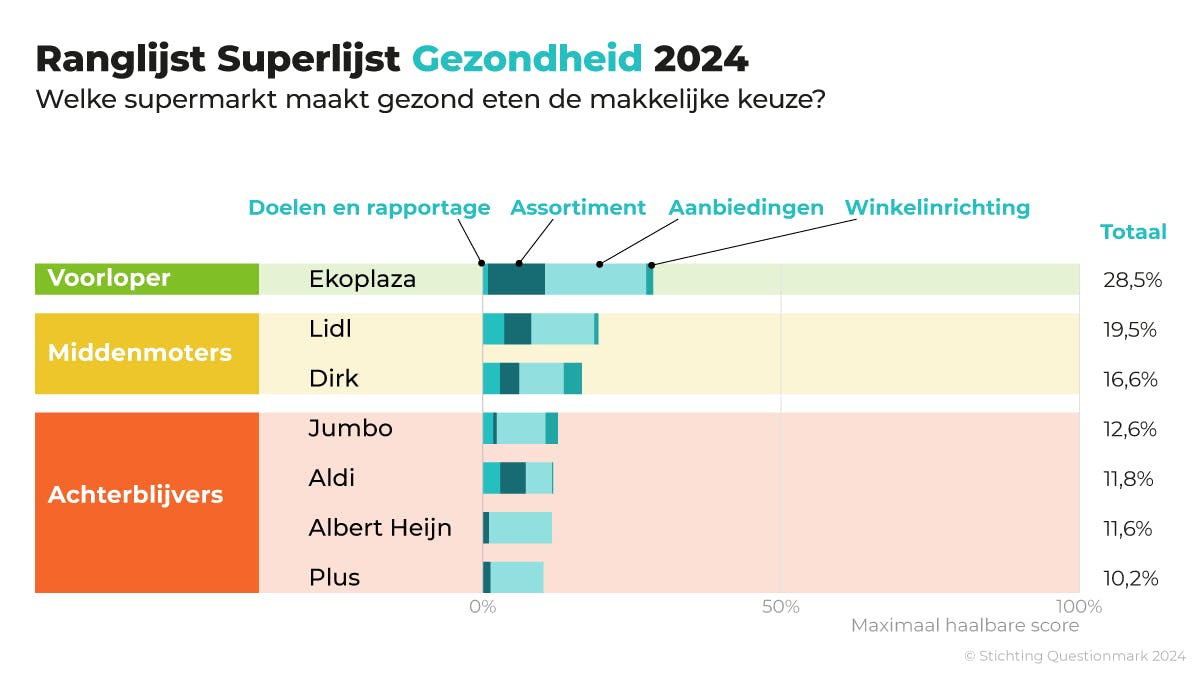 Superlist Health in the Netherlands compares Dutch supermarkets bi-annualy on their contribution to a healthy food systeme. The seven largest supermarkets (Albert Heijn, Aldi, Dirk, Ekoplaza, Jumbo, Lidl and Plus) are compared on their policies, assortment, promotions and store design. This is the third edition of Superlist Health in the Netherlands and compares the findings to two years ago.