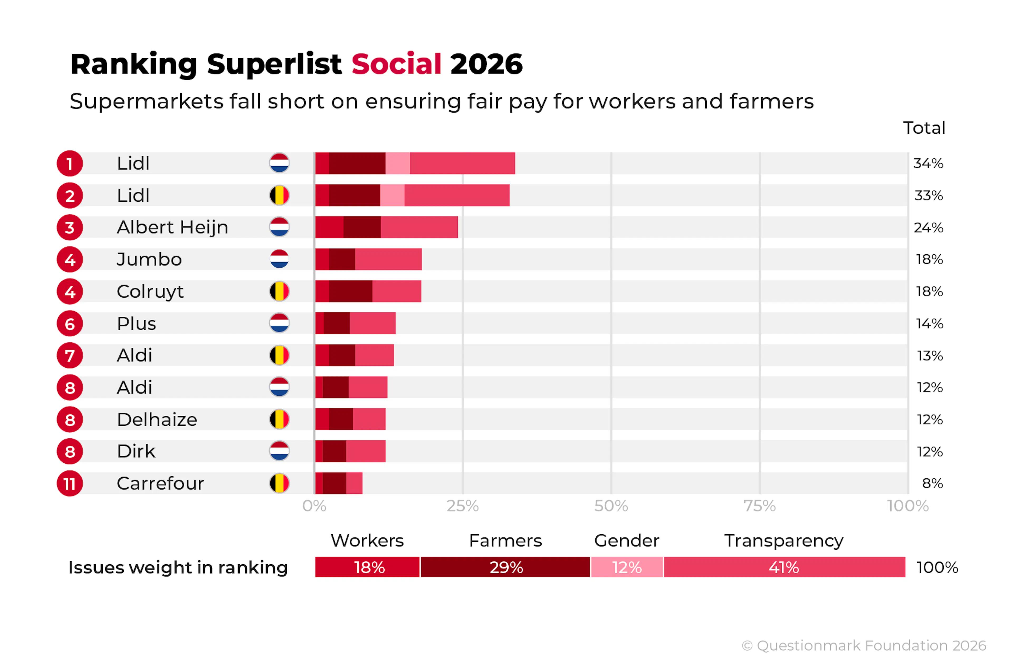 Superlist Social in the Netherlands and Belgium (2026) compares Dutch and Belgian supermarkets on their contribution to a fair food system. For the first time, Dutch and Belgian supermarkets are combined in one research. The six largest Dutch supermarkets and five largest Belgian supermarkets will be compared on their performances in respecting human rights in their supply chains. The first Superlist Social in the Netherlands was published in 2023, and the first Superlist Social in Belgium was published in 2024.