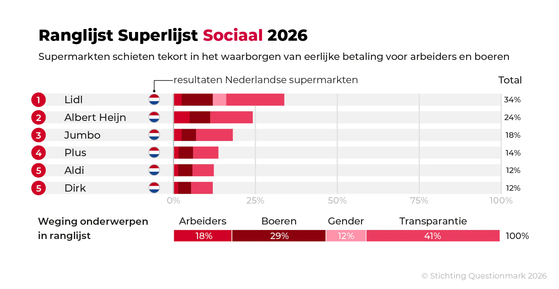 Dutch supermarkets are still taking too few measures within their international supply chains to ensure that farmers and workers receive fair pay. At the same time, these retailers are well aware of the significant risks of human rights abuses in their chains, such as child labor and underpayment. While supermarkets are making progress in the banana and cocoa sectors, a comprehensive approach for all high-risk products is currently lacking. These findings come from the latest edition of Superlist Social, the benchmark on supermarkets' human rights policies. The efforts of all retailer, ranging from frontrunner Lidl to laggard Dirk, remain inadequate.